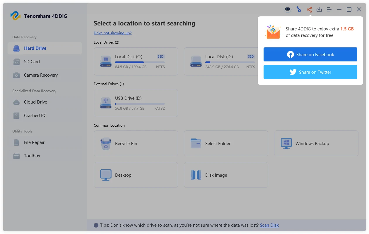 Launch 4DDiG Free and connect the SD card you want to recover to your computer. Then, select “SD Card” and click “Scan”. (First-time users can get 500MB of free recovery space, and by sharing on social media, you can receive an additional 1.5GB for free.)